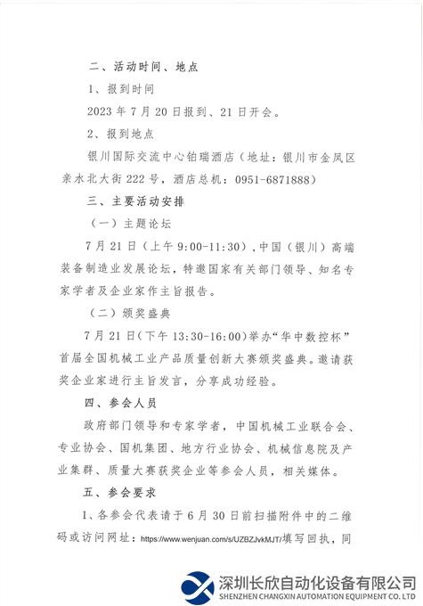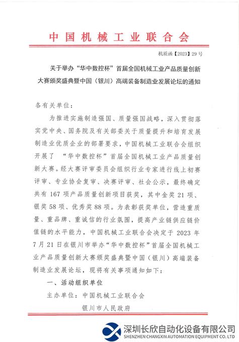 关于举办“华中数控杯”首届全国机械工业产品质量创新大赛颁奖盛典暨中国(银川)高端装备制造业发展论坛的通知